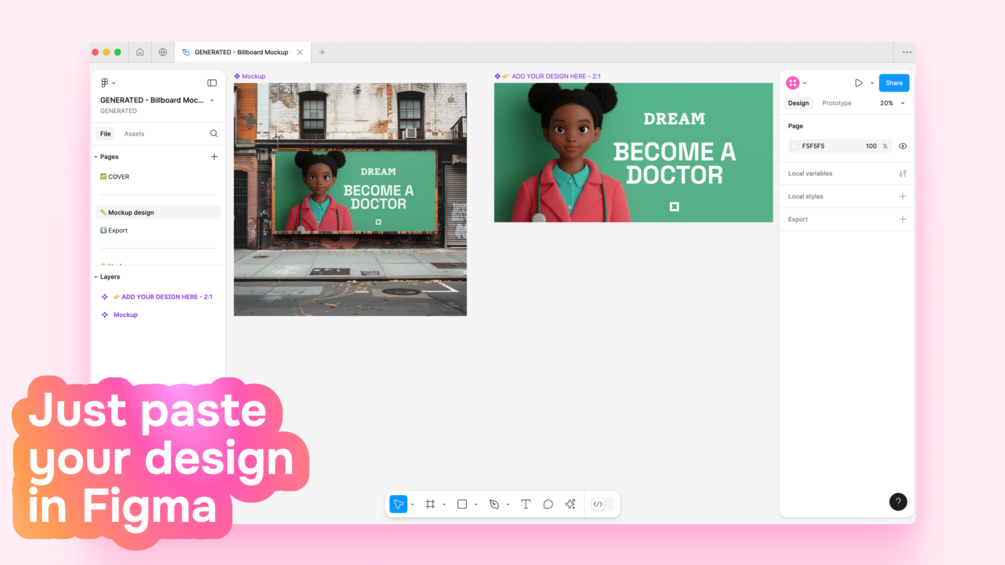 It’s the fastest way to visualize your designs in a real environment, all within Figma. Simply drop your design into the perfectly scaled mockup and see how it looks in the real world.